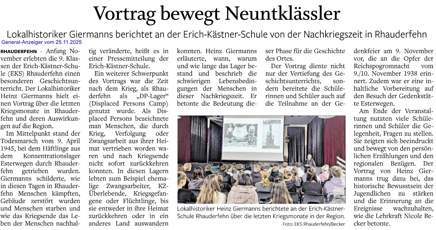 Am Dienstag, den 4. November 2025, fand für die 9. Klassen der Erich Kästner Schule Rhauderfehn ein besonderer Vortrag im Rahmen des Geschichtsunterrichts statt. Der Lokalhistoriker Herr Giermanns berichtete eindrucksvoll über die Ereignisse der letzten Kriegsmonate in Rhauderfehn und deren Folgen für die Region.