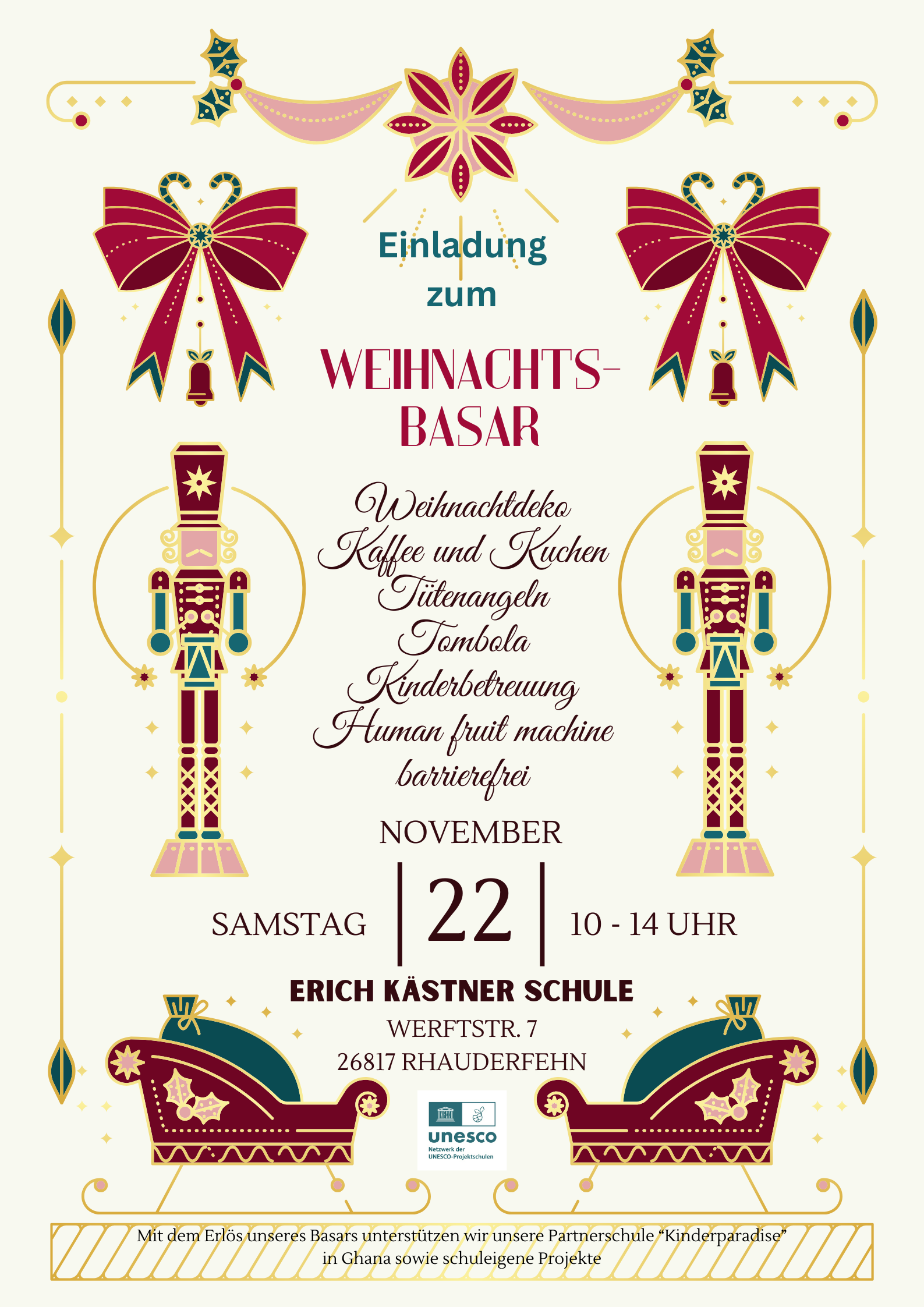 Am Samstag, dem 22.11, findet wieder der alljährliche Weihnachtsbasar der EKS statt. Besucherinnen und Besucher können sich auf liebevoll gestaltete Stände, handgemachte Geschenke, leckere Köstlichkeiten und eine festliche Atmosphäre freuen. Die Schulgemeinschaft lädt herzlich dazu ein, gemeinsam in die Adventszeit zu starten!