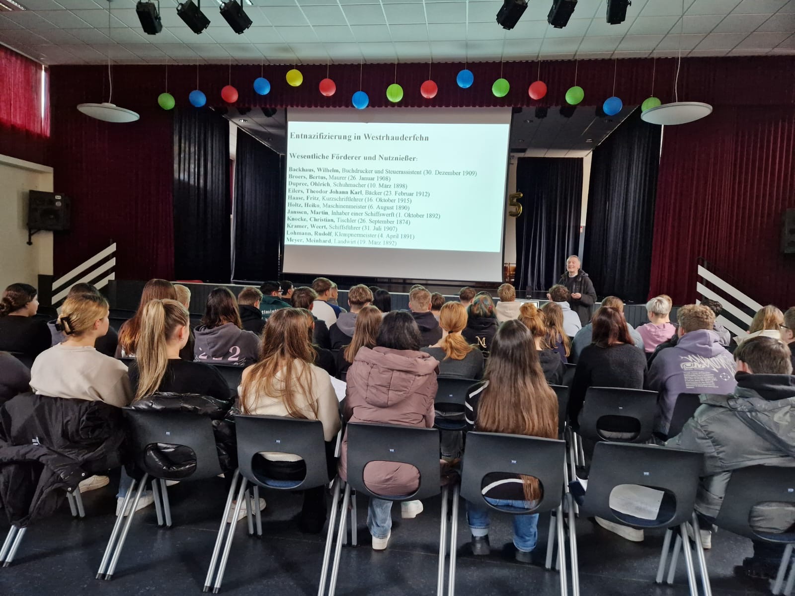 Am Dienstag, den 4. November 2025, fand für die 9. Klassen der Erich Kästner Schule Rhauderfehn ein besonderer Vortrag im Rahmen des Geschichtsunterrichts statt. Der Lokalhistoriker Herr Giermanns berichtete eindrucksvoll über die Ereignisse der letzten Kriegsmonate in Rhauderfehn und deren Folgen für die Region.