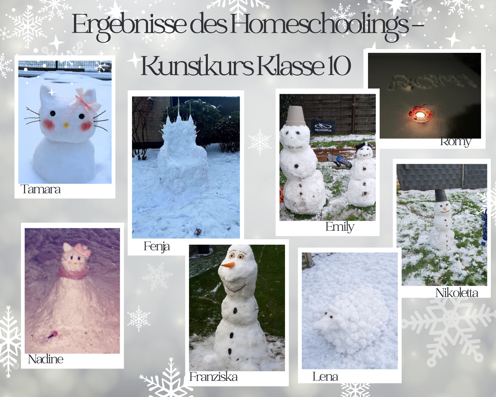 In den letzten Tagen gestalteten die Schülerinnen und Schüler der Klasse 10 im Homeschooling im Rahmen des Kunstkurses kreative Eisskulpturen und Eislaternen. Mit viel Fantasie und handwerklichem Geschick entstanden Kunstwerke aus Eis und Schnee.